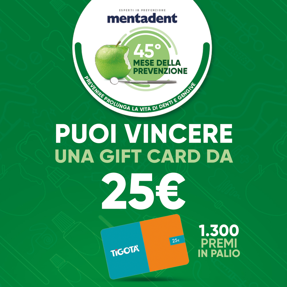Acquista almeno due prodotti Mentadent nei punti vendita Tigotà, conserva lo scontrino e registrati su questo sito. Puoi vincere 25€ in gift card Tigotà.